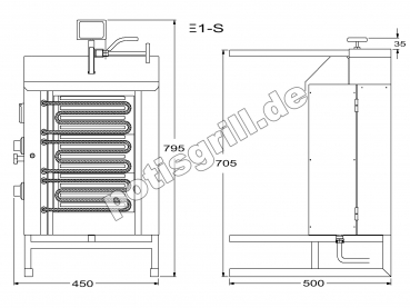 Der POTIS E1 Dönergrill aus der Sonderfertigung der E-Links Serie bietet mit 450 × 500 mm Stellfläche (ohne Fettwanne) und 795 mm Gerätehöhe eine kompakte Lösung, ideal wenn rechts weitere Geräte stehen. Mit Fettwanne misst die Stellfläche 500 × 650 mm.
