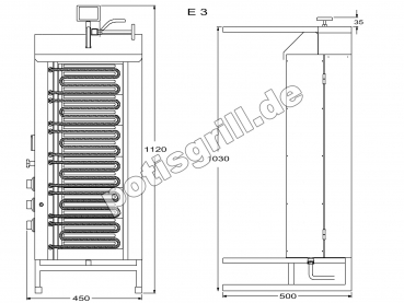 Der POTIS E3 Dönergrill aus der Sonderfertigung der E-Links Serie bietet mit 450 × 500 mm Stellfläche ohne Fettwanne und 500 × 650 mm mit Fettwanne eine kompakte Lösung, ideal für enge Küchen, besonders wenn rechts Geräte oder Ablagen stehen. Die Gerätehöhe inklusive Motor beträgt 1120 mm.