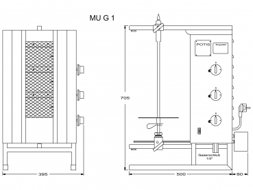Der POTIS MU G1 Dönergrill bietet eine kompakte Stellfläche von 395 x 500 mm (ohne Fettwanne) und eine Gerätehöhe von 705 mm, wodurch er sich ideal für kleine bis mittelgroße Gastronomiebetriebe eignet. Mit einer Leistung von 5,25 kW sorgt der Infrarot-Brenner für gleichmäßige Hitzeverteilung und perfekte Bräunung des Fleischs.